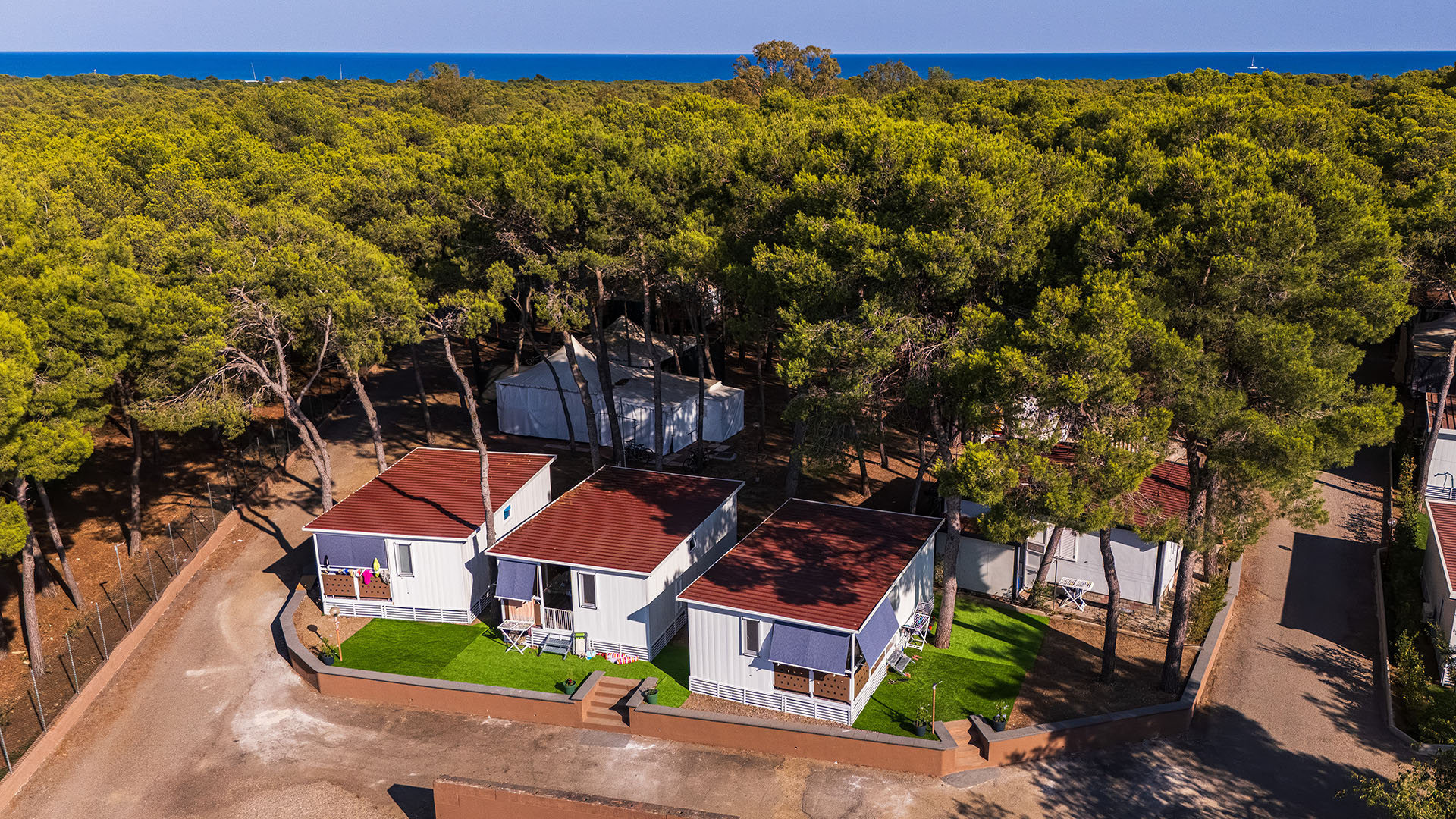 Sono composti da una veranda coperta, cucina monoblocco, wc con doccia, 2 camere da letto (l’una matrimoniale e l’altra con 2 letti singoli a terra). Sono dotati di tutti gli utensili da cucina (piatti, bicchieri, stoviglie ecc.), climatizzatore, tv led e arredamento esterno.