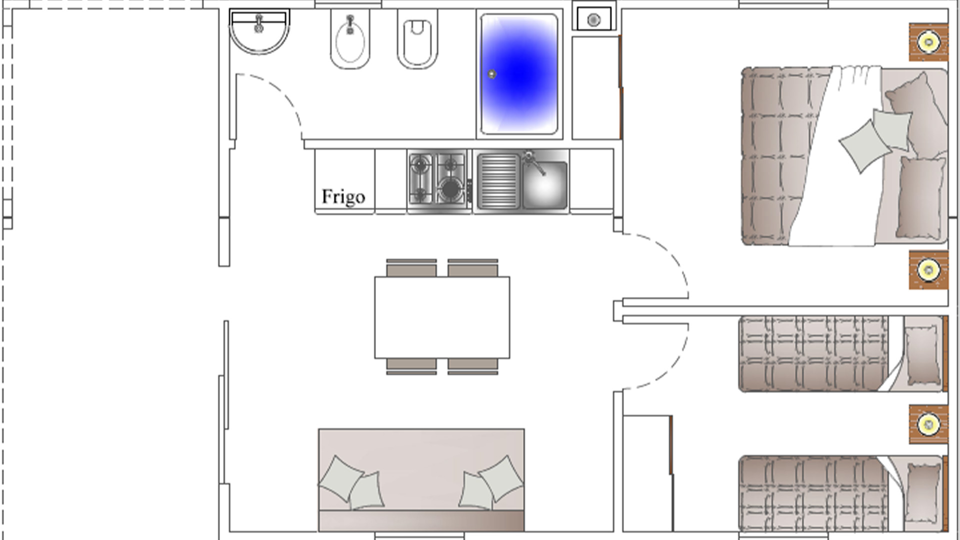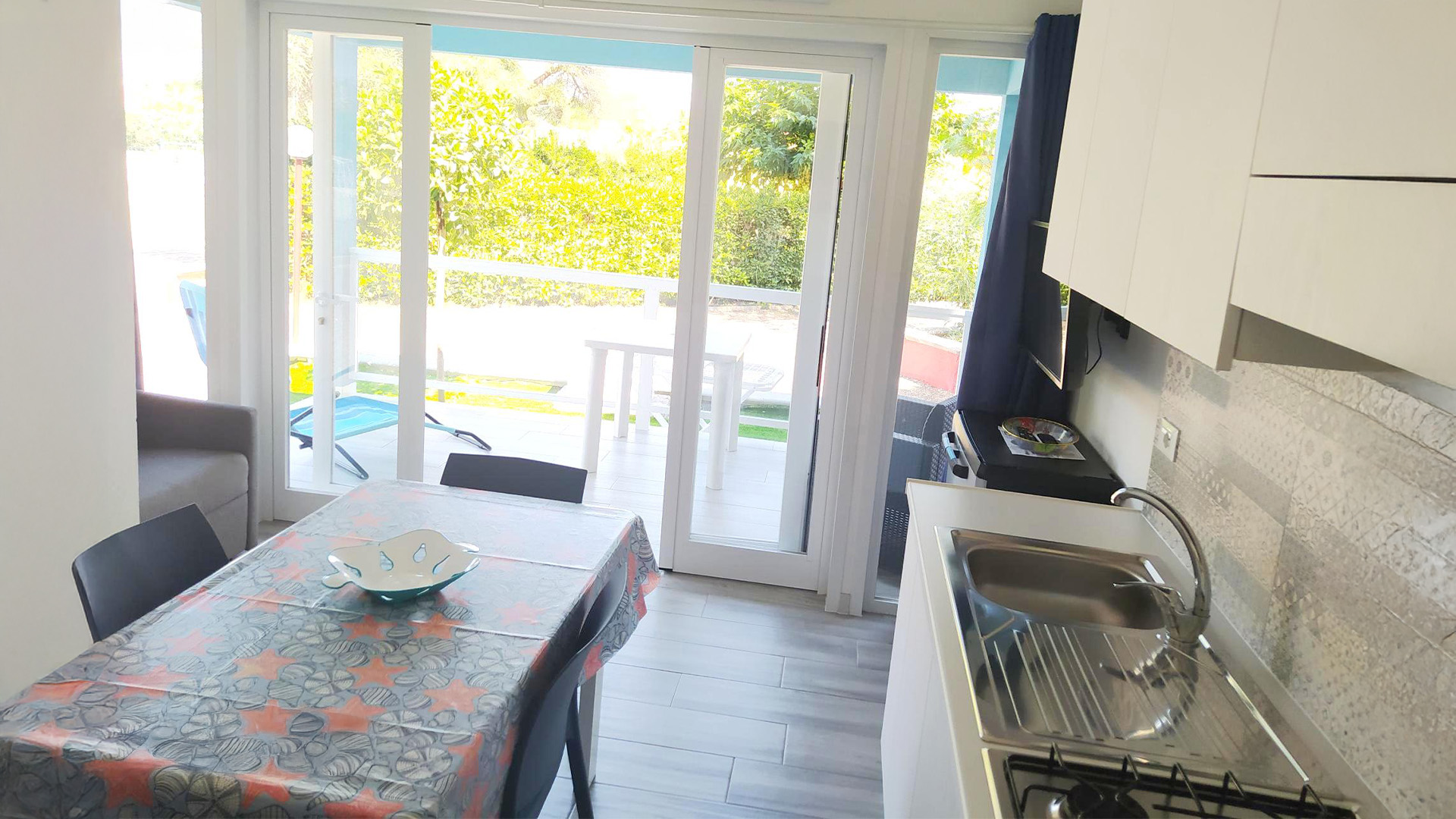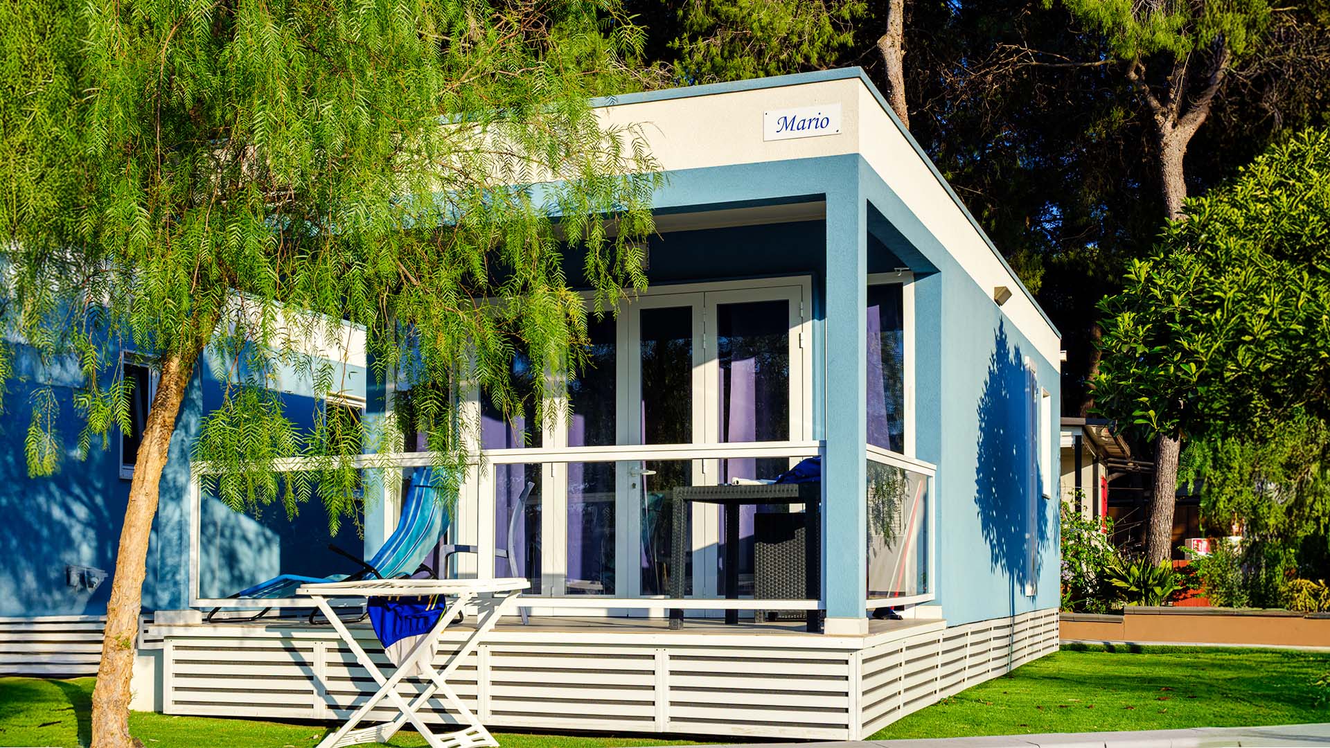 Sono composti da una veranda coperta, cucina monoblocco, wc con doccia, 2 camere da letto (l’una matrimoniale e l’altra con 2 letti singoli a terra). Sono dotati di tutti gli utensili da cucina (piatti, bicchieri, stoviglie ecc.), climatizzatore, tv led e arredamento esterno.
