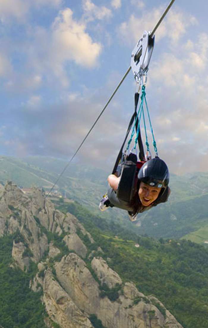 Unico in Italia, il Volo dell’Angelo renderà possibile il sogno di volare. E per chi ama condividere tutto, anche le emozioni mozzafiato, dallo scorso anno è ormai possibile effettuare il volo in coppia! Imbracati a pancia in giù ad un cavo d’acciaio che collega le vette dei borghi di Castelmezzano e Pietrapertosa, già noti come i “Borghi più belli d’Italia” delle Dolomiti Lucane, sarà possibile vivere l’ebbrezza della velocità in volo lungo un tragitto di circa 1500 metri, sorvolando a 400 mt di altezza un paesaggio mozzafiato. Ogni tragitto dura circa un minuto e mezzo e la velocità può toccare anche i 120 km orari. Adrenalina ed emozione in assoluta sicurezza!